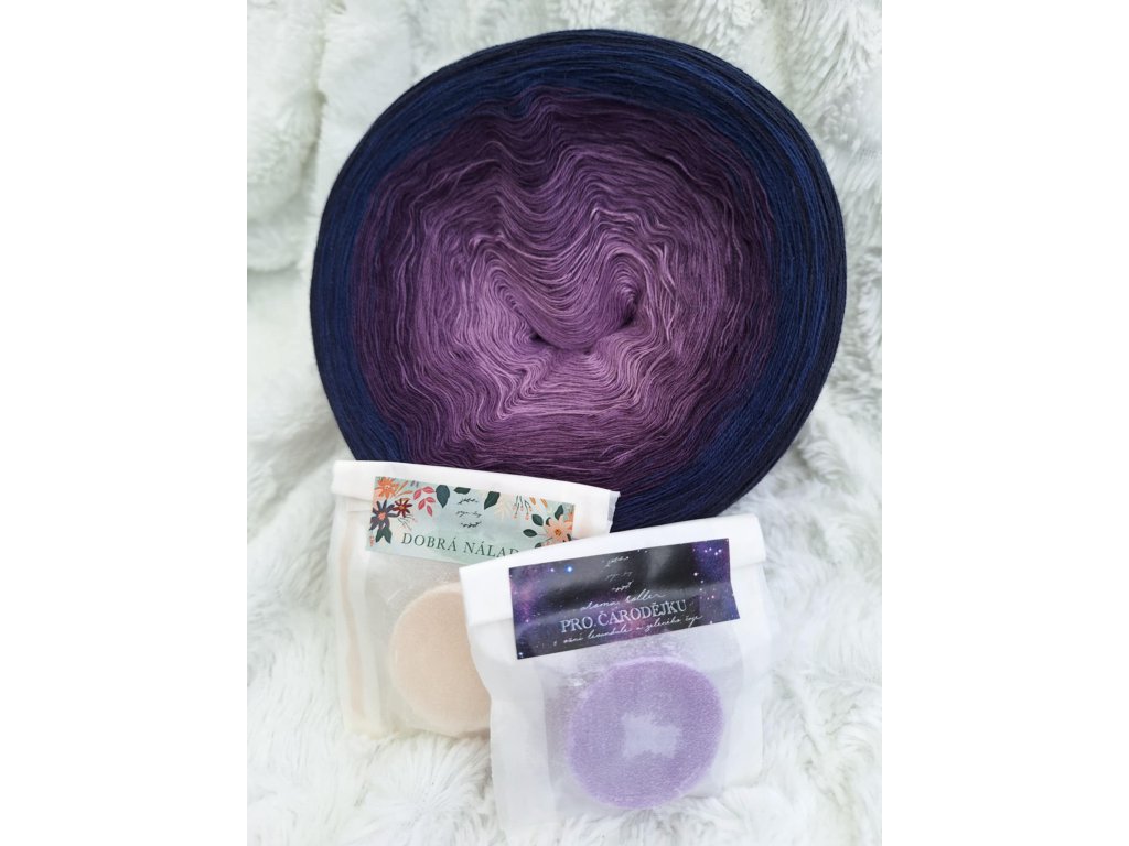 Ponořte se do tvoření plného tajemství s naší sadou Čarodějka. Tato kombinace klubíčka v odstínech od mystické fialové po hlubokou, temně modrou v sobě nese sílu noci a vnitřní moudrost. Vonné spojení zeleného čaje a levandule je stvořeno, aby zklidnilo Vaši mysl, podpořilo soustředění a pomohlo Vám najít hluboký klid. Jeho sílu navíc umocňují krystaly ametystu a černého turmalínu, které zklidňují prostor a chrání vaši energii, abyste se mohli plně oddat své kreativitě.