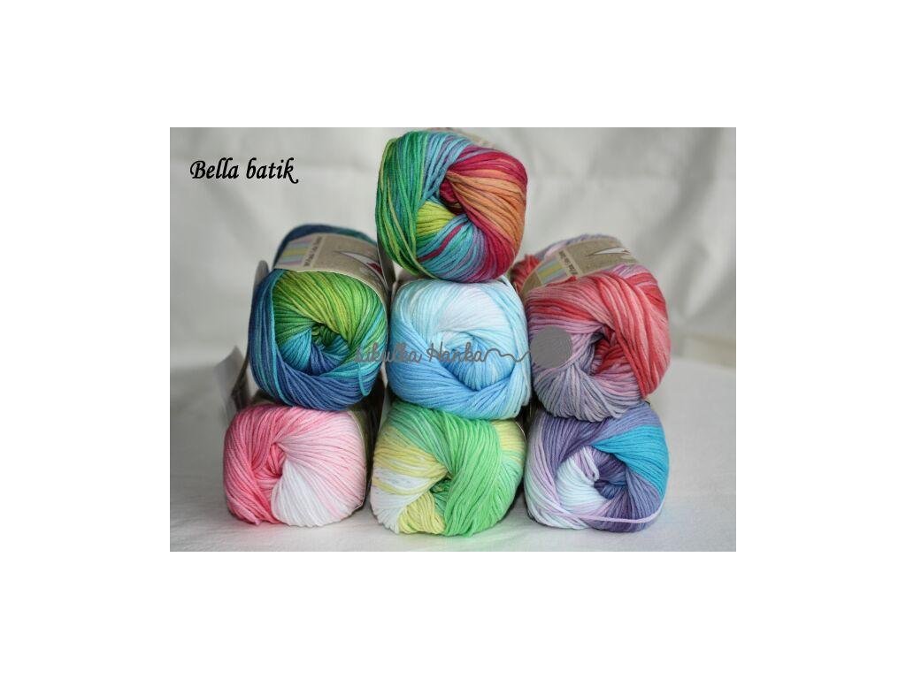 Bella Batik 100 je příze ze 100% bavlny v krásných batikovaných odstínech, které vytvářejí jemné barevné pruhy a přechody přímo v pletenině či háčkovaném projektu. Stejně jako klasická Bella 100 je hebká, prodyšná a šetrná k pokožce, takže je vhodná i pro děti a citlivé nositele.