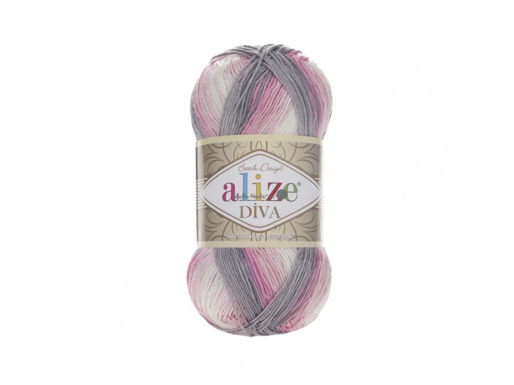 Diva Batik je příze s hebkým povrchem a elegantním leskem, který dodá každému projektu nádech luxusu. Je lesklá, hladká, proto se skvěle hodí na pletení i háčkování letního oblečení, svetříků, šátků, čepiček či elegantních doplňků. Výborně poslouží také na háčkované tašky nebo síťovky.