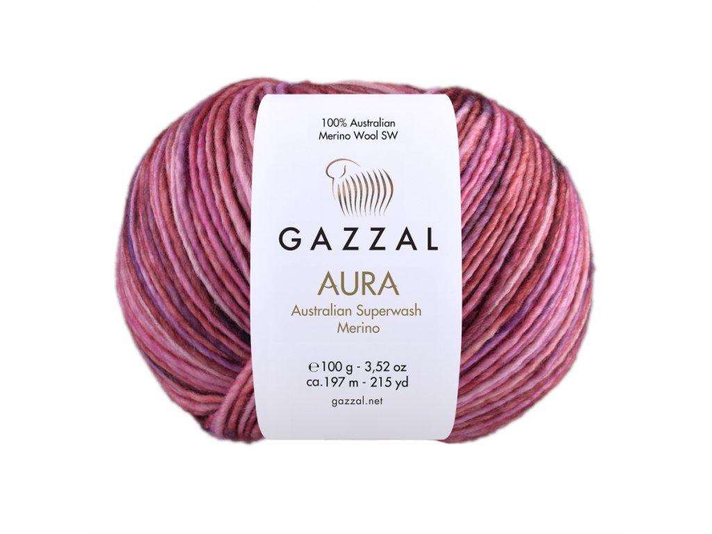 Příze Aura od Gazzal je luxusní příze z 100% australské superwash merino vlny, která vyniká svou jemností, odolností a pohodlím při nošení. Díky jemné struktuře vláken je příjemná na dotek, nedráždí pokožku, krásně hřeje a zároveň dobře dýchá. Každé klubíčko je ručně barvené, a proto je naprosto jedinečné – barevné přechody vytvářejí originální kombinace, díky nimž se každý projekt stává osobním a neopakovatelným dílem.