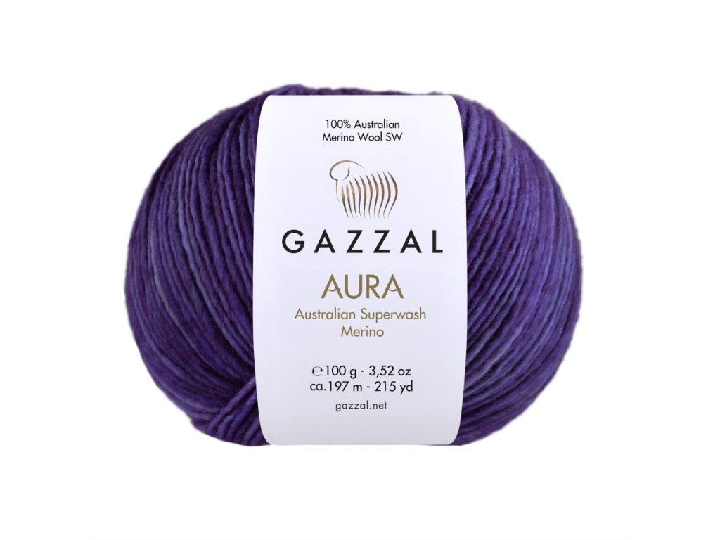 Příze Aura od Gazzal je luxusní příze z 100% australské superwash merino vlny, která vyniká svou jemností, odolností a pohodlím při nošení. Díky jemné struktuře vláken je příjemná na dotek, nedráždí pokožku, krásně hřeje a zároveň dobře dýchá. Každé klubíčko je ručně barvené, a proto je naprosto jedinečné – barevné přechody vytvářejí originální kombinace, díky nimž se každý projekt stává osobním a neopakovatelným dílem.