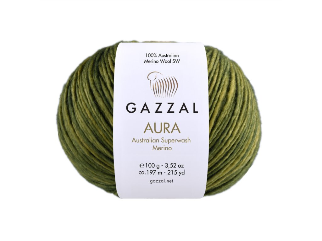 Příze Aura od Gazzal je luxusní příze z 100% australské superwash merino vlny, která vyniká svou jemností, odolností a pohodlím při nošení. Díky jemné struktuře vláken je příjemná na dotek, nedráždí pokožku, krásně hřeje a zároveň dobře dýchá. Každé klubíčko je ručně barvené, a proto je naprosto jedinečné – barevné přechody vytvářejí originální kombinace, díky nimž se každý projekt stává osobním a neopakovatelným dílem.