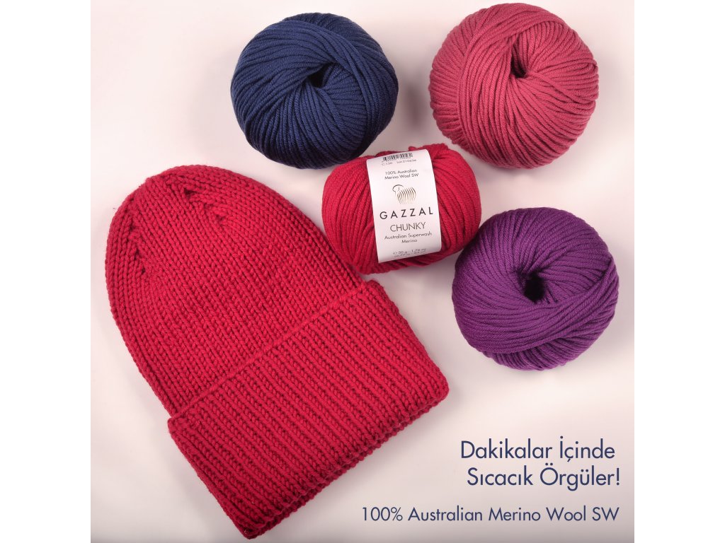 Příze Gazzal Chunky je silnější a mimořádně hřejivá příze vyrobená ze 100% australské merino vlny Superwash, která patří mezi nejkvalitnější přírodní vlákna na světě. Merino vyniká svou jemností, prodyšností a schopností skvěle regulovat teplotu – zahřeje, ale zároveň se nepřehřívá. Díky tomu je příze příjemná i citlivější pokožce a výborně se nosí.