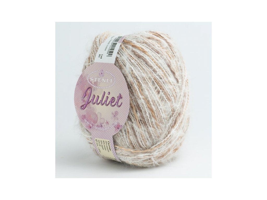 Příze Juliet je univerzální příze vhodná na celoroční tvoření. Kombinuje jemné bavlněné nitky s měkkou směsí akrylu a merina, je nadýchaná, příjemná na dotek, dobře drží tvar. Vlákno je různě široké a efektní, což dodává hotové pletenině na eleganci a zároveň to zaručuje vždy originální výsledek. Zajímavého efektu lze dosáhnout také použitím různě velkých jehlic.